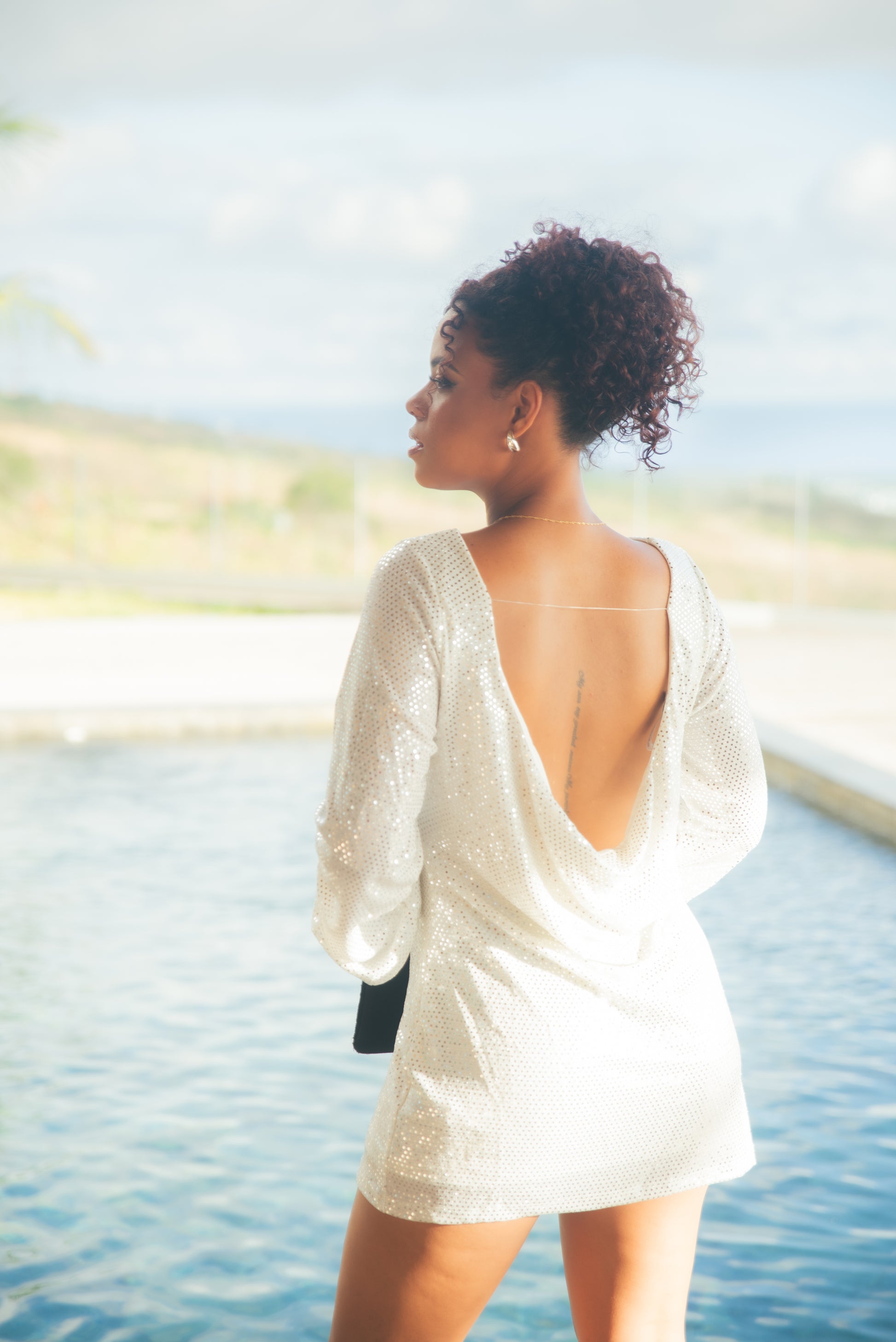 Le détail qui fait toute la différence : son dos plongeant drapé, délicatement travaillé pour un effet glamour tout en restant élégant.