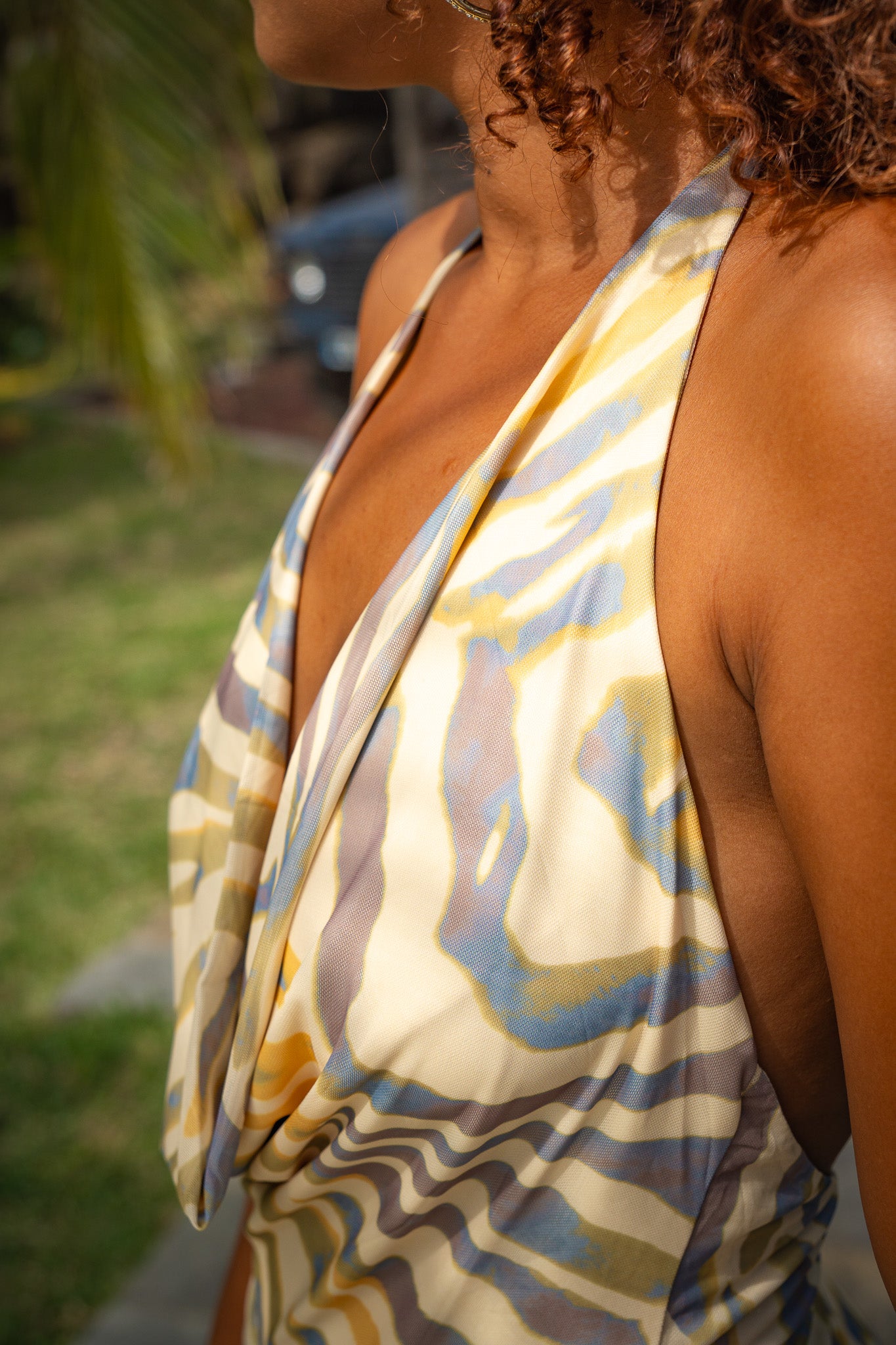 ✔ Lien à nouer derrière la nuque, assurant un maintien élégant et ajustable.